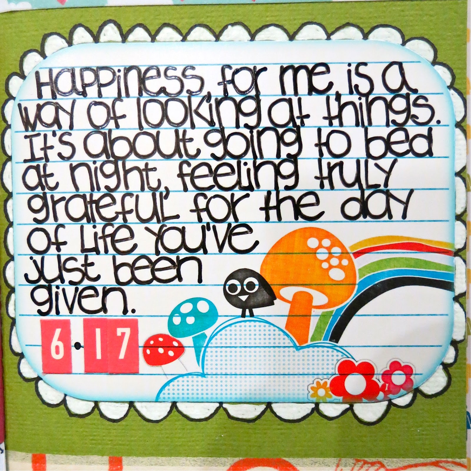 Prompt #23 was a free choice page. Janel did a page similar to this and I was so inspired, I decided to do one too. I traced around Michael and my hands, cut them out and glued them on the page. I totally tried to do the same thing with the cats - and umm, that was less than successful - ha. You should of seen me following them around with a piece of patterned paper, trying to get ahold of a foot. They were not having any of that. In the end, I settled for cutting their paws out of a photograph...